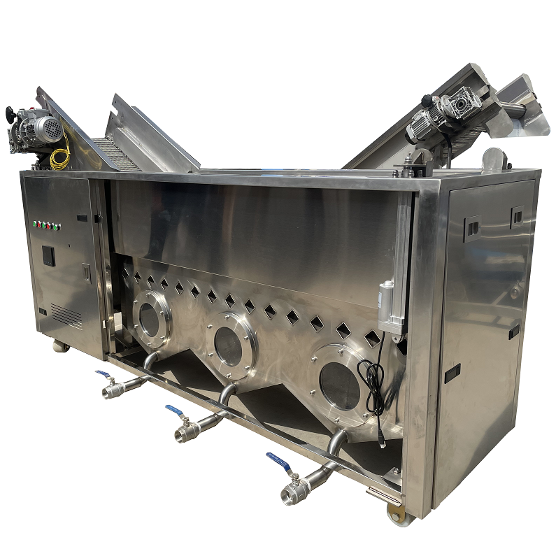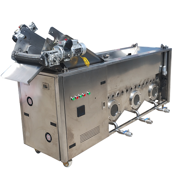 連續(xù)式油水混合油炸設備由一條在恒溫油槽中的不銹鋼網(wǎng)格傳送帶構成 ,由雙網(wǎng)帶無級變速輸送系統(tǒng)、主油槽箱與輔助油箱組成的外循環(huán)過濾系統(tǒng)、PID油溫自控儀、XSM轉數(shù)線速儀表以及繩索提升裝置等組成,采用多種加熱方式給食用油加熱(電加熱或燃氣加熱)。食品被緩慢地定量送入油中,下沉到浸泡在油中的傳送帶上 ,食品在炸熱和炸熟時呈懸浮狀。則被壓在另一條傳送帶下 ,食品油炸、上料及卸料采一條用傳送帶,減少中間環(huán)節(jié),卸料時斜坡提升使多余的油流回油槽中。