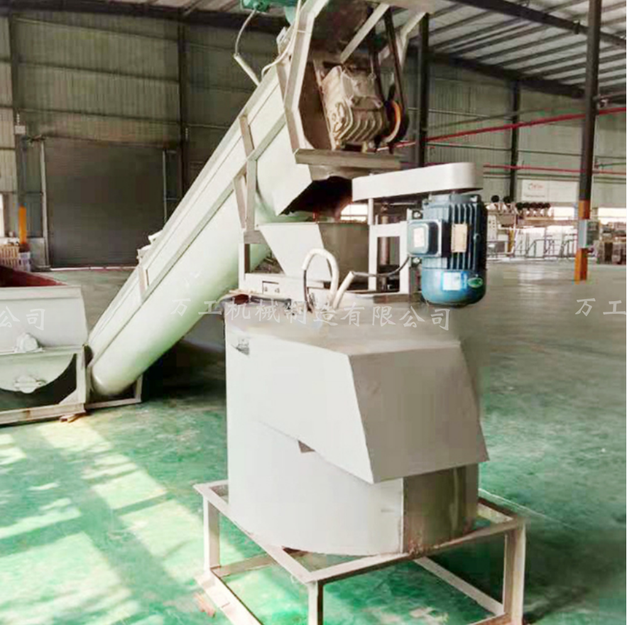一套設(shè)備(清洗流水線)清洗過程分為預(yù)洗、主洗和漂洗。先利用脫標(biāo)機進行脫標(biāo),就是將塑料瓶的外包裝去除掉。然后經(jīng)輸送帶進入塑料破碎機進行破碎,再經(jīng)輸送帶傳到凈水分離槽將肥料漂出,然后進入到鍋爐進行熱洗。在經(jīng)過幾個凈水分離槽對破碎的塑料進行徹底的漂凈工作,很后又甩干機進行甩干。