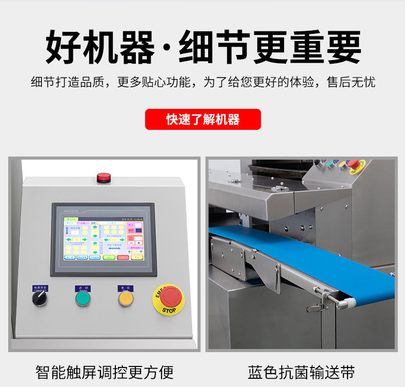 1、 搓餅裝置。餅胚大小改變時,可通過高度調節(jié)螺絲來改變壓延輥高度,以免餅胚壓延程度大或不足,整形裝置亦有手柄調節(jié),以保證餅胚搓成圓柱體,以便成型。